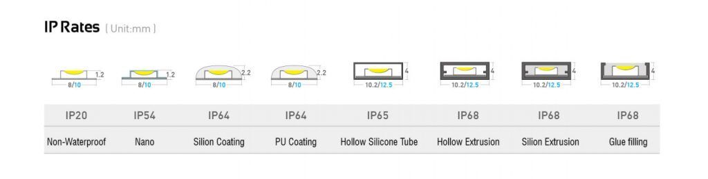 選擇IP等級很簡單。環境越惡劣、灰塵越多,您需要的 IP 保護就越多。通常,低IP等級條適合室內使用。如果您想要防水 LED 燈條,請選擇防護等級為 IP65、IP67 或 IP68 等級的燈條。根據要安裝 LED 燈條的條件選擇保護級別。